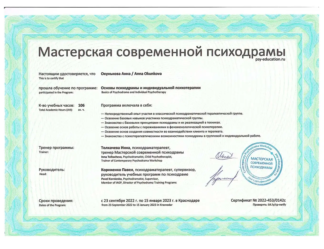 • 2022 - Мастерская современной психодраммы (Сертификат об обучении по программе "Основы психодрамы и индивидуальной психотерапии")