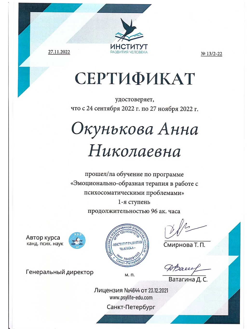 • 2022 - Институт развития человека (Сертификат о прохождении обучения по программе "Эмоционально-образная терапия в работе с психосоматическими проблемами")
